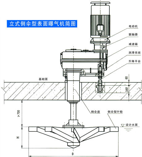 TXS(大功率)倒傘型表面曝氣機主要由電機、減速箱、潤滑系統、升降平臺、倒傘座、倒傘葉輪、電控系統等部分組成。整機為立式結構,占地小,不易受飛濺的污水所侵蝕。